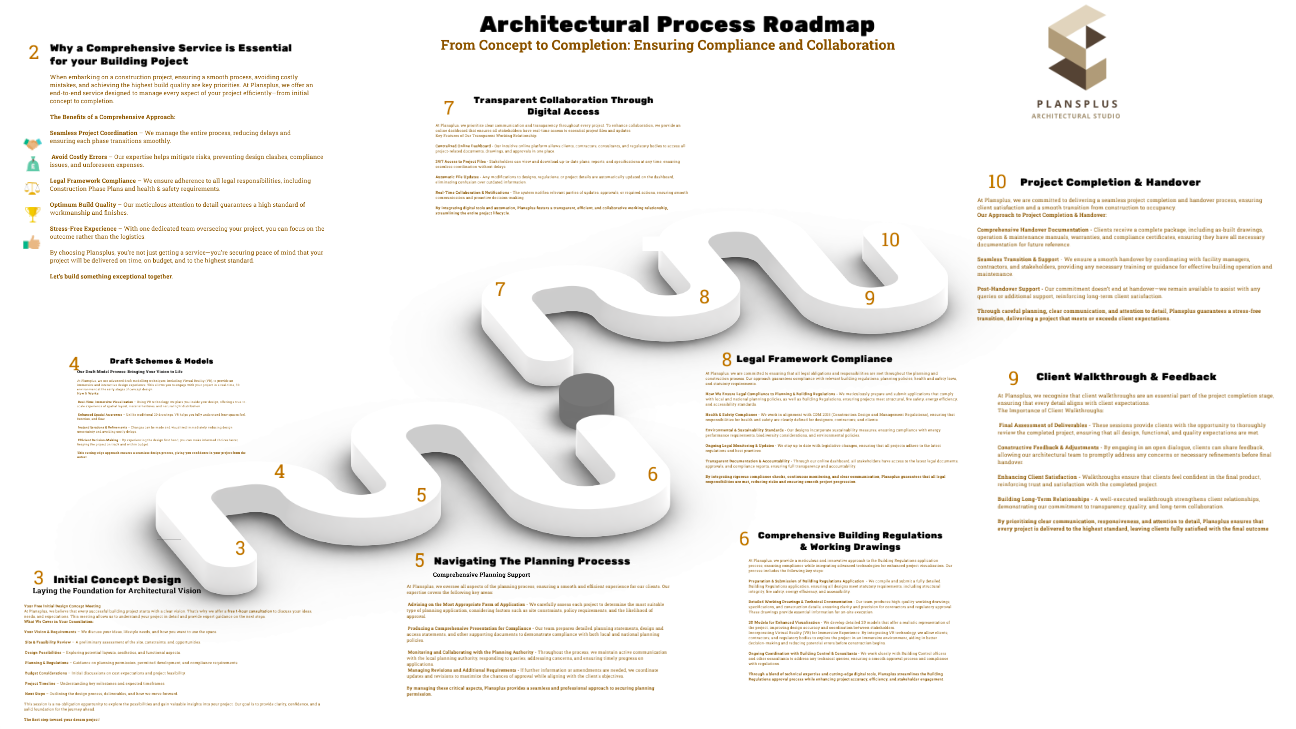 Take a look at our Architectural Process Roadmap to help you navigate the journey through your project & explain how the end-to-end approach ensures a smooth transition from Concept to Completion
